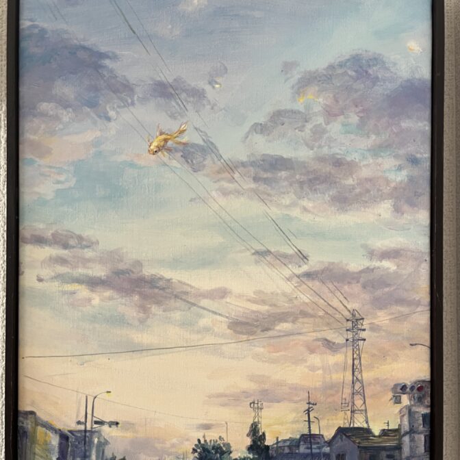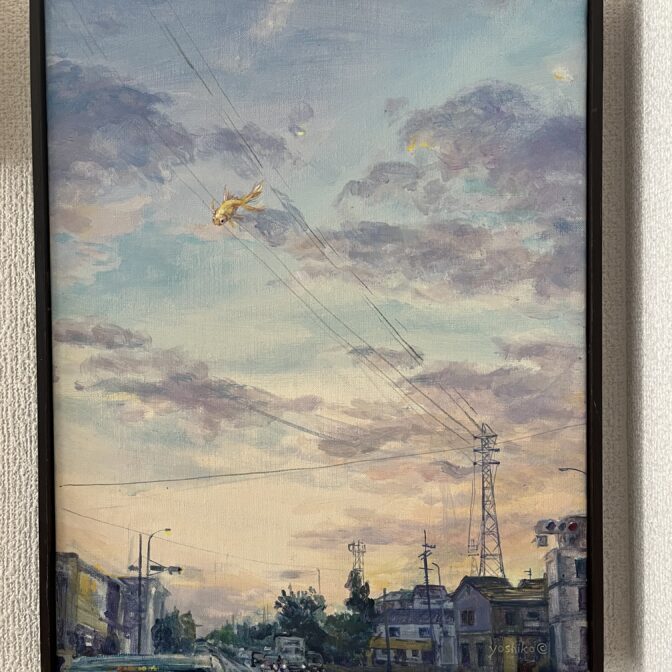 毎日通る道路から見た朝焼けが綺麗だったので描きました。明るくなってきた朝の空が「おはよう」と言っているような感じがする作品です。